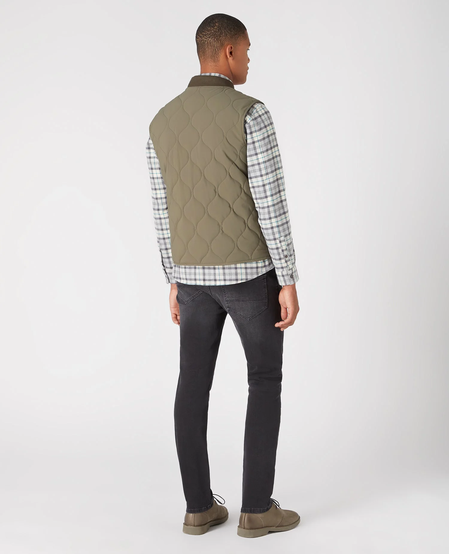 Khaki green lightweight quilted gilet with side entry zip pockets, low cut jersey collar and metal snap fastening buttons.