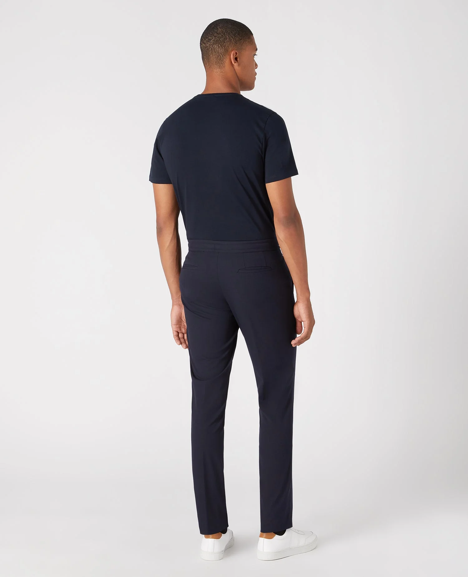 Navy slim leg stretch trouser with feature stretch waistband and concealed drawstring. Low rise, slim seat and thigh with x-slim hem.