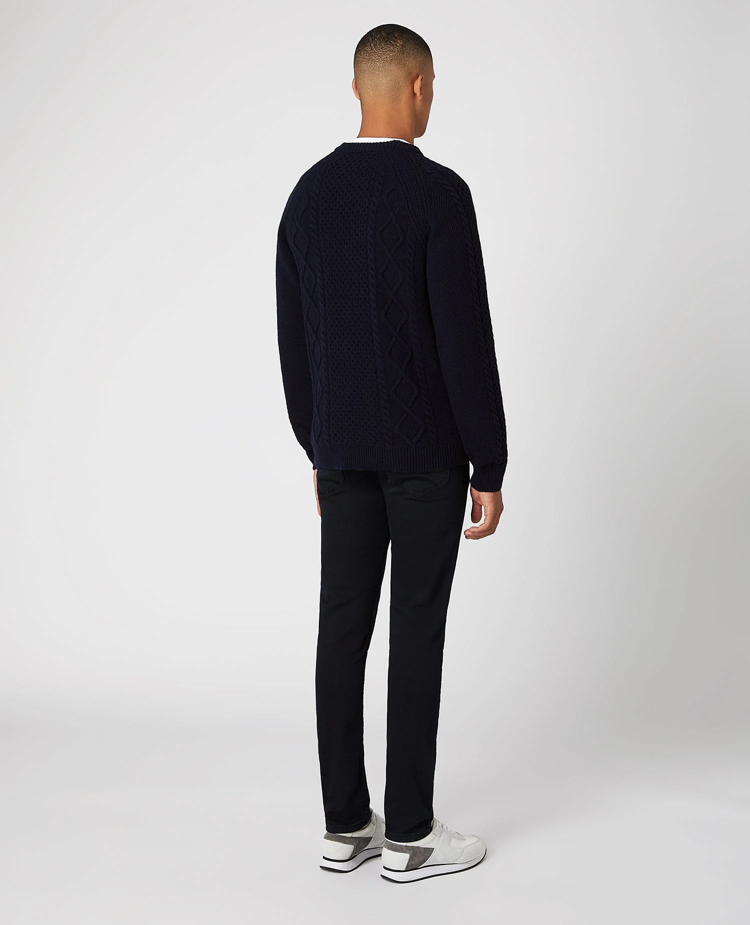 Navy tapered fit medium guage wool-blend crew neck sweater with heavy texture design and ribbed cuff and hem.
