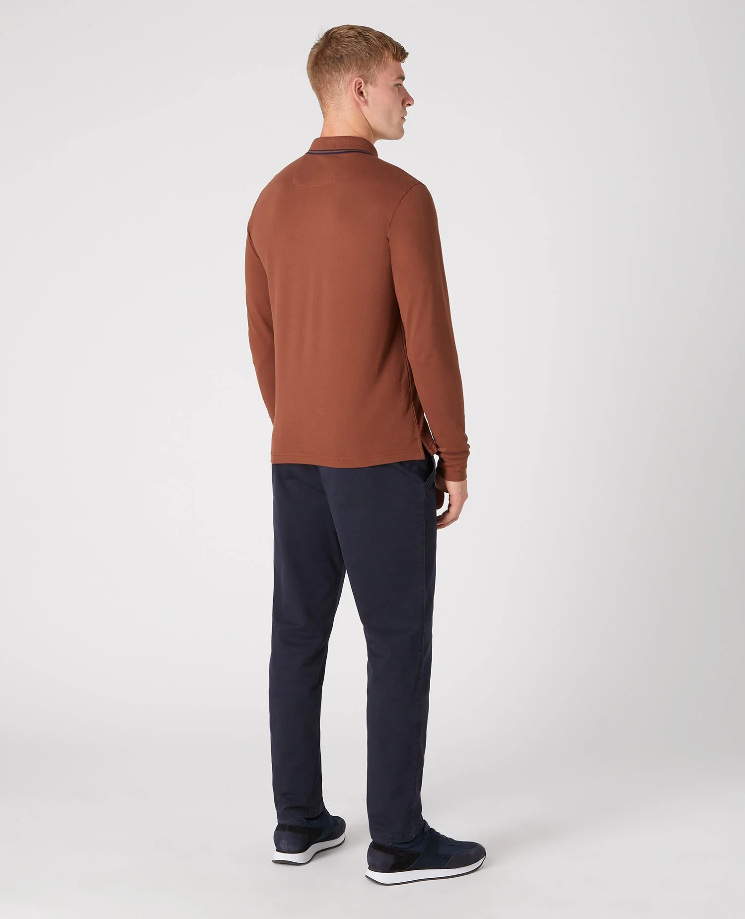 Terracotta slim cotton-stretch long sleeve pique polo with chest embroidary, contrast tipping on the collar and three button closing