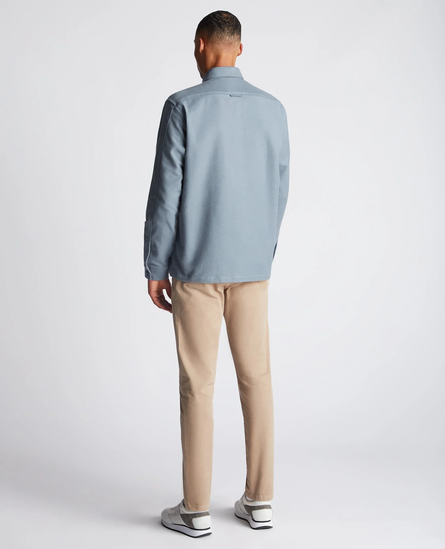 Blue grey regular fit heavyweight cotton overshirt with pointed collar, french front, square cuff and double chest patch pocket, concealed stud button flap with brushed cotton feel.