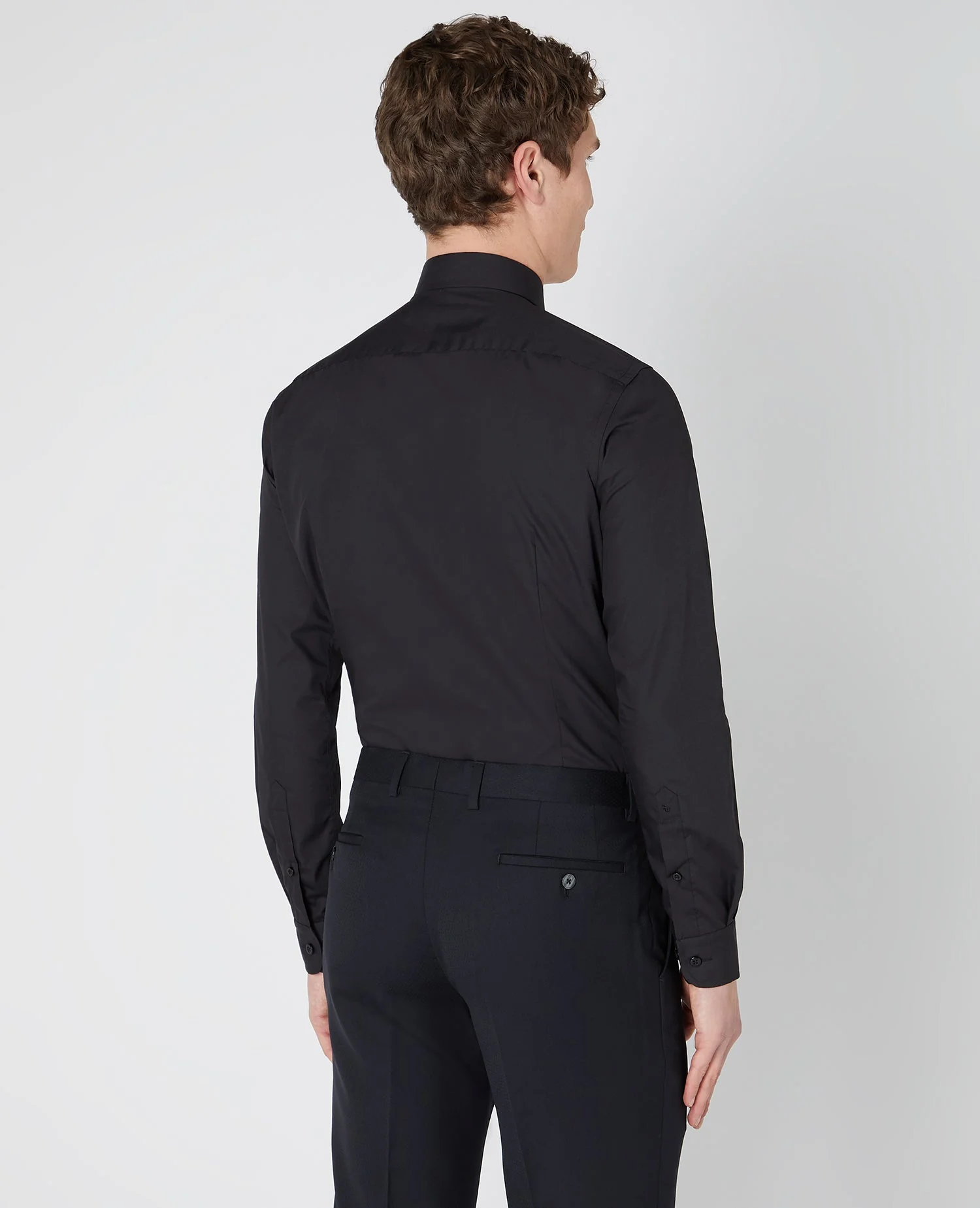 Black slim fit cotton-blend long-sleeve shirt with french front and narrow pointed collar.