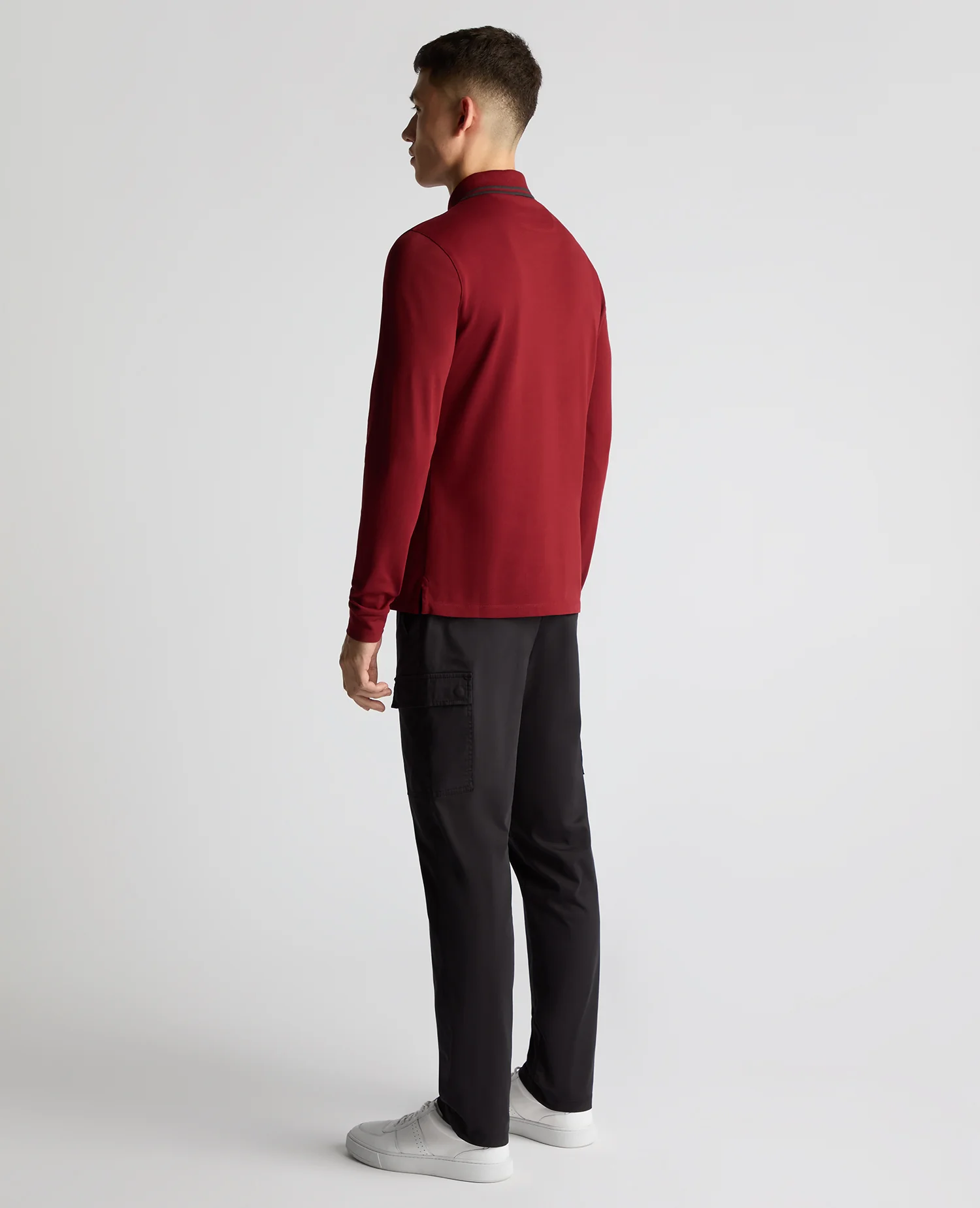 Red slim cotton-stretch long sleeve pique polo with chest embroidery, contrast tipping on the collar and three button closing