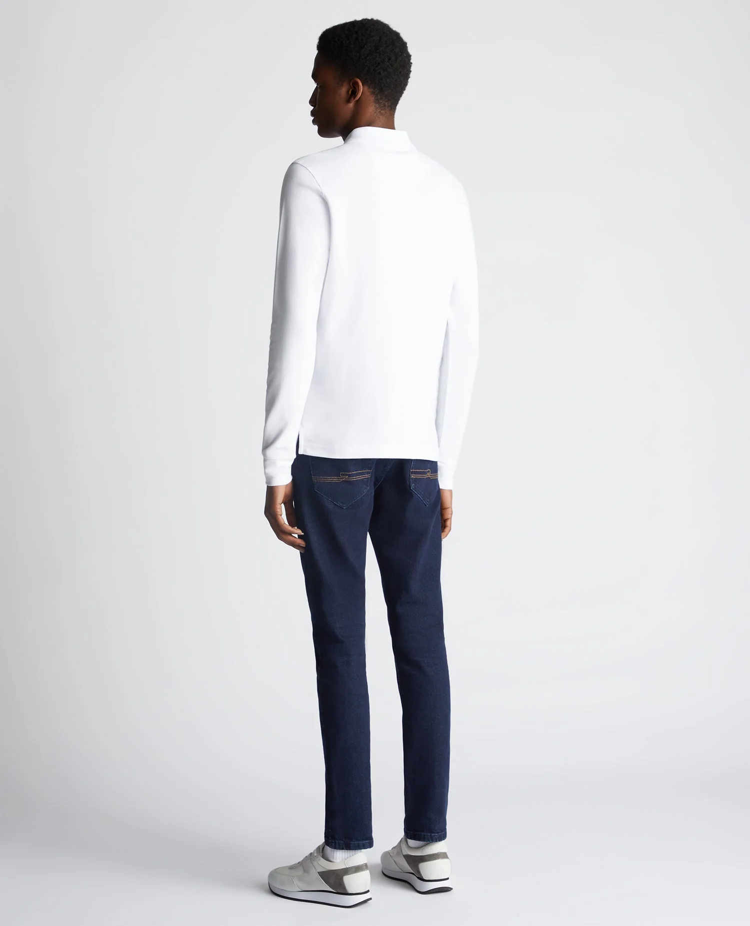 White slim fit cotton-stretch long sleeve pique polo with chest embroidary, contrast tipping on the collar and three button closing. If you prefer an easier fit , we recommend sizing up for this garment.