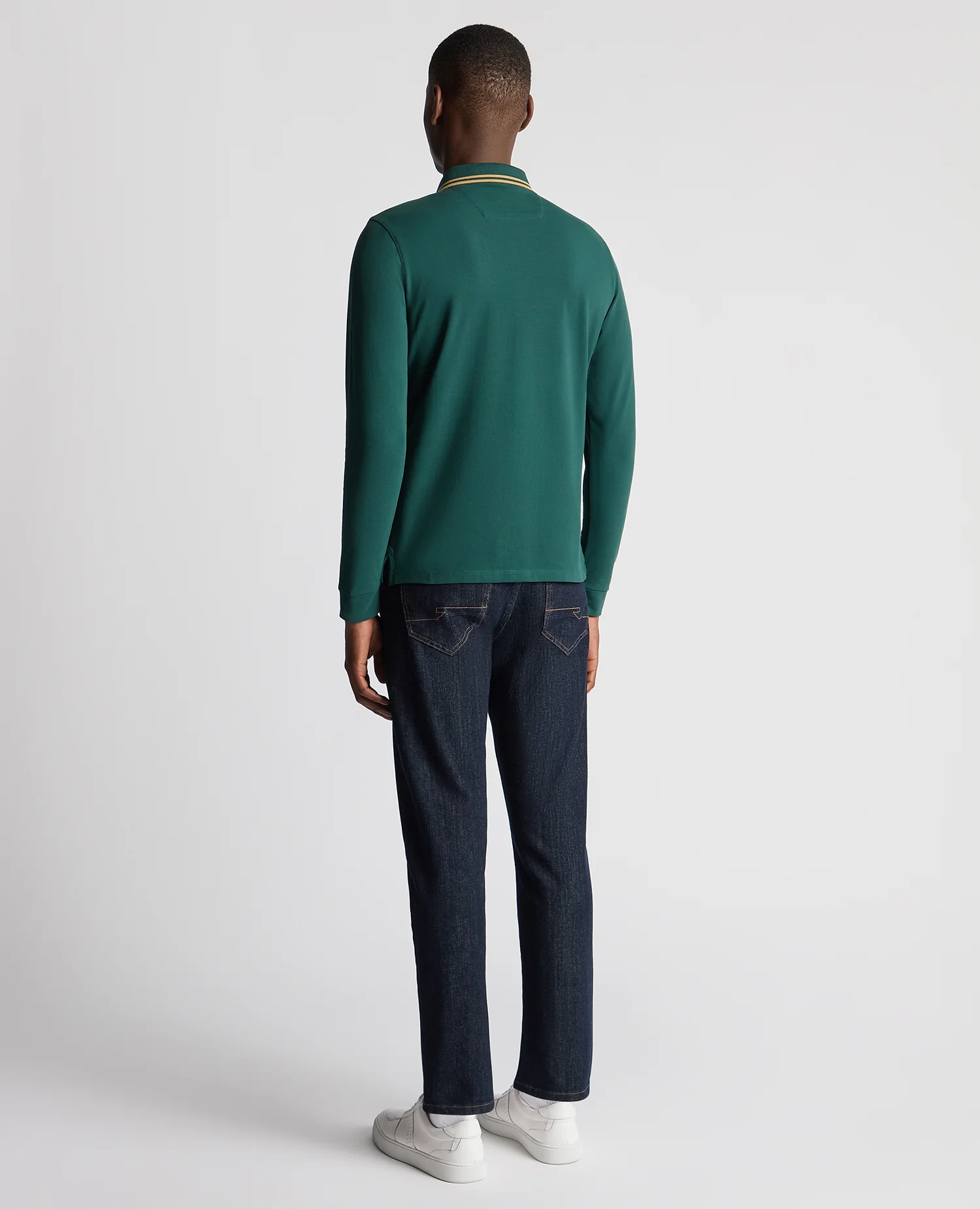 Green slim cotton-stretch long sleeve pique polo with chest embroidery, contrast tipping on the collar and three button closing