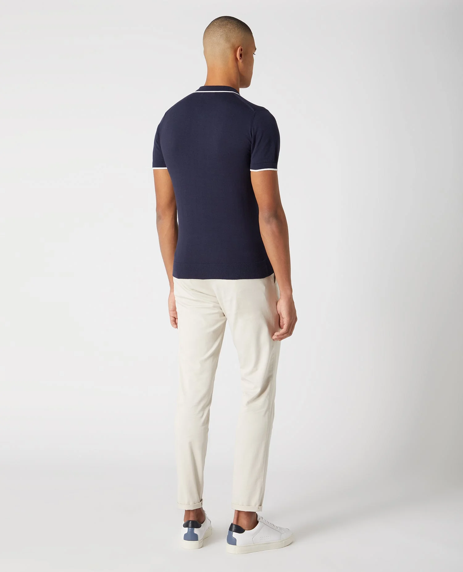 Navy slim fit knitted cotton short-sleeve polo shirt in plain single bed knit with tipped open ribbed collar, cuff and hem.