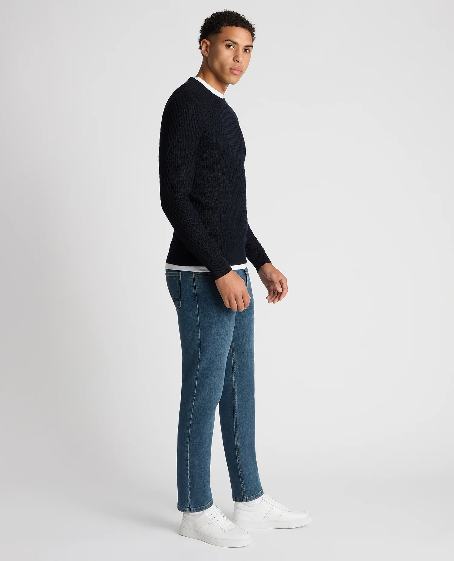 Navy tapered fit merino wool-blend crew neck sweater with all over basket weave knit structure. Ribbed collar, cuffs and hem.