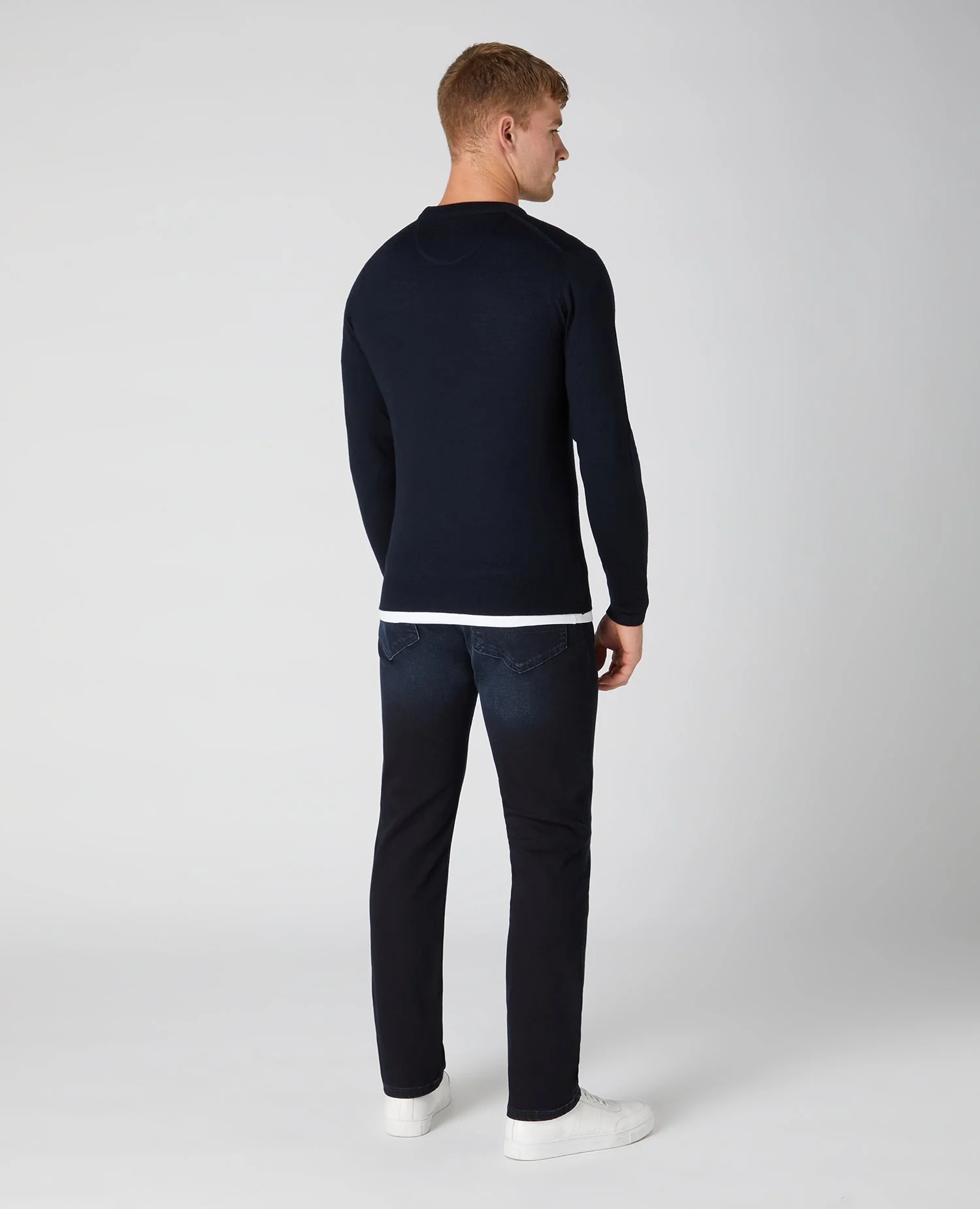 Navy tapered fit fine gauge merino wool-blend crew neck sweater with ribbed cuff and hem.