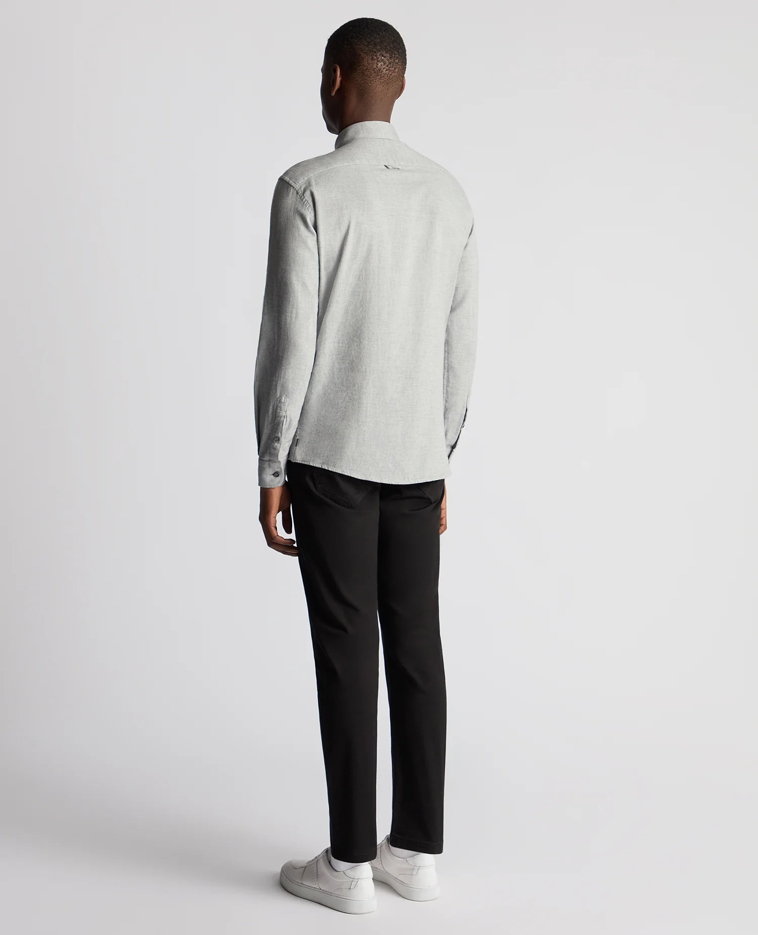 Grey tapered fit shirt. Soft brushed cotton feel. Buttoned down collar, placket front, contrast ribbon, chest embroidery with a back yoke loop and tailed hem.