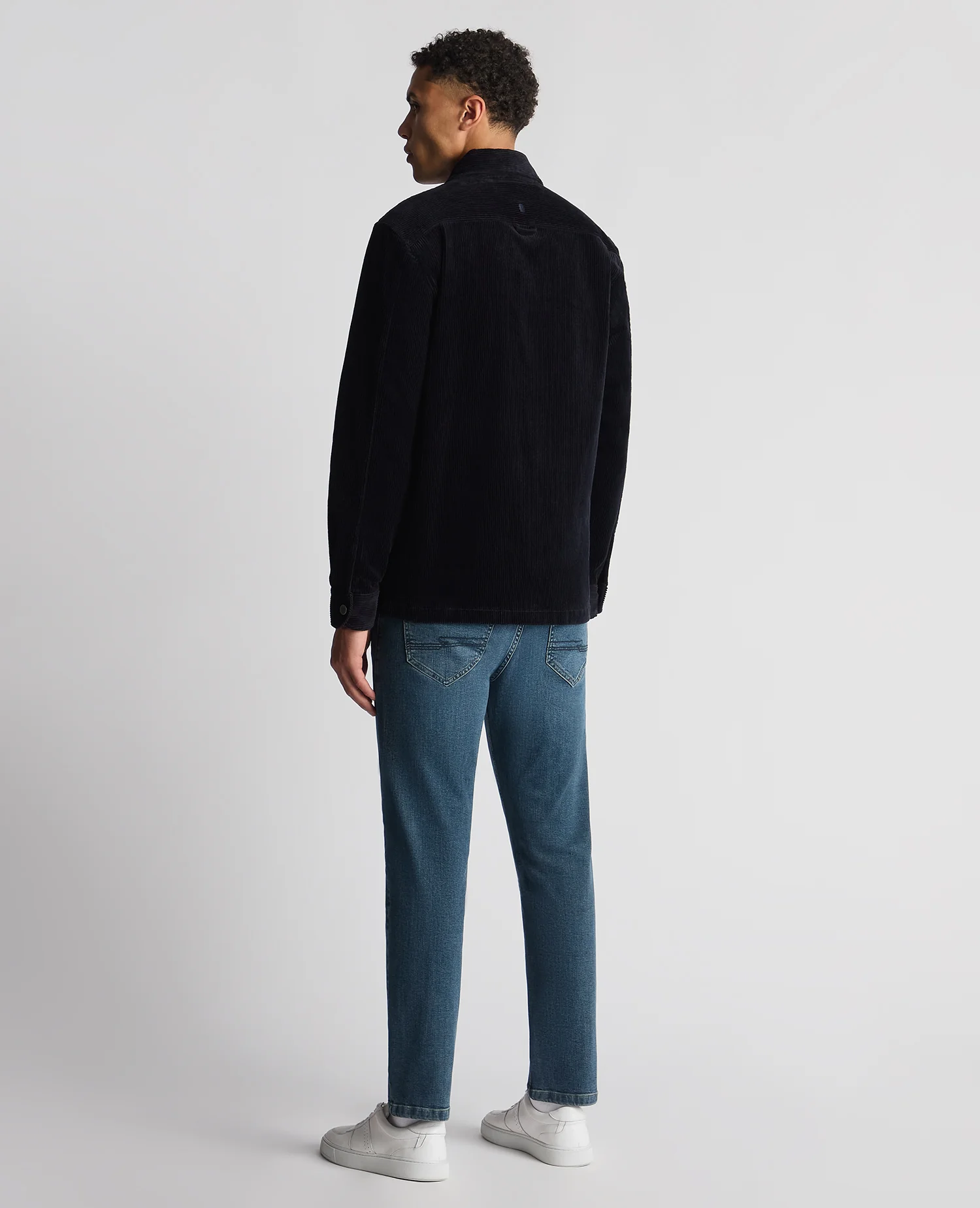Navy tapered fit long sleeve corduroy overshirt. french front and stud button fastening. Double chest pocket with concealed button flaps. Bar tack on chest pockets and sleeve vents. Finished with a back yoke loop and flat hem.