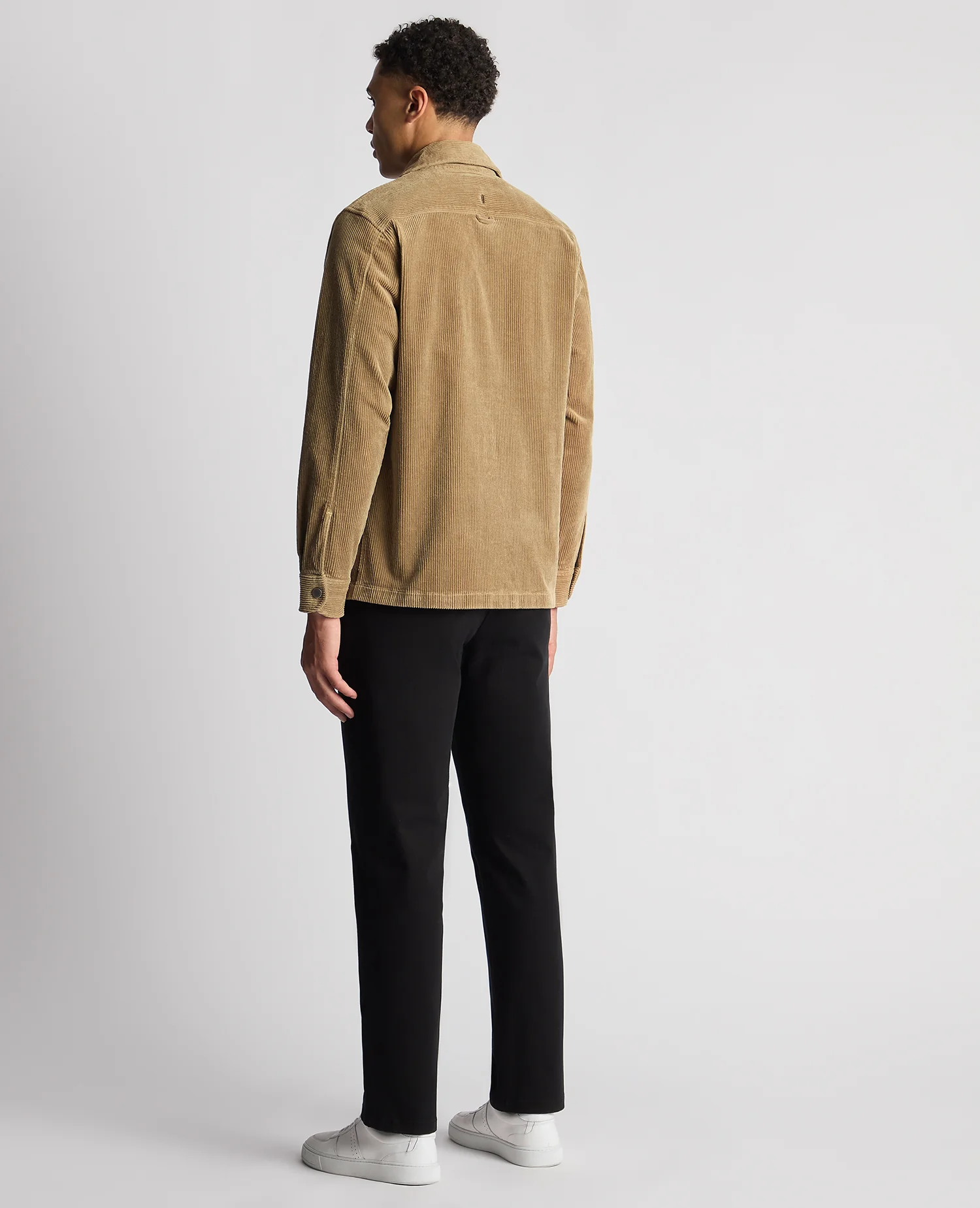 Beige tapered fit long sleeve corduroy overshirt. french front and stud button fastening. Double chest pocket with concealed button flaps. Bar tack on chest pockets and sleeve vents. Finished with a back yoke loop and flat hem.