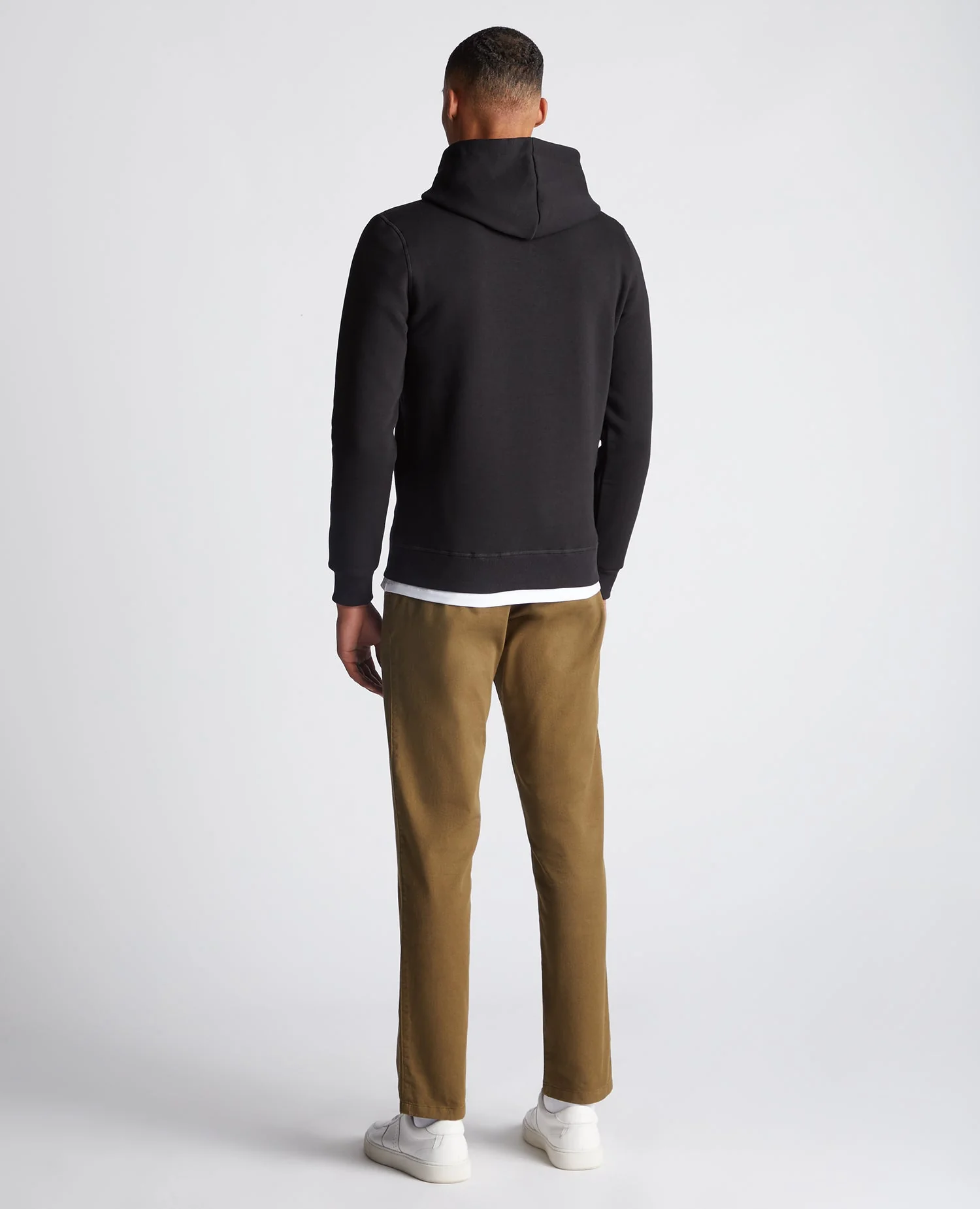 Black tapered fit cotton-blend fleeceback hoodie with embroidery on hip and ribbed cuff and hem. If you prefer an easier fit , we recommend sizing up for this garment.