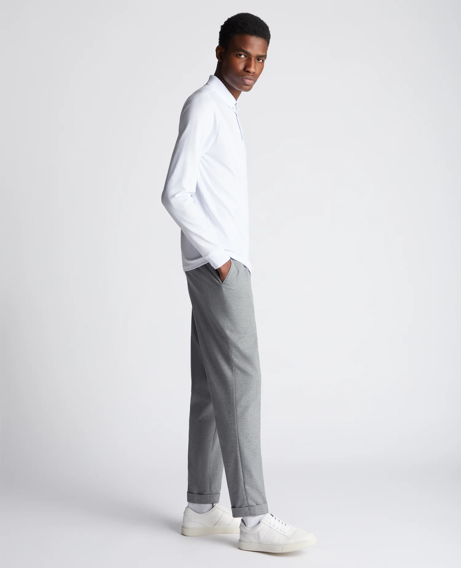 White tapered fit cotton-blend long seeve polo shirt