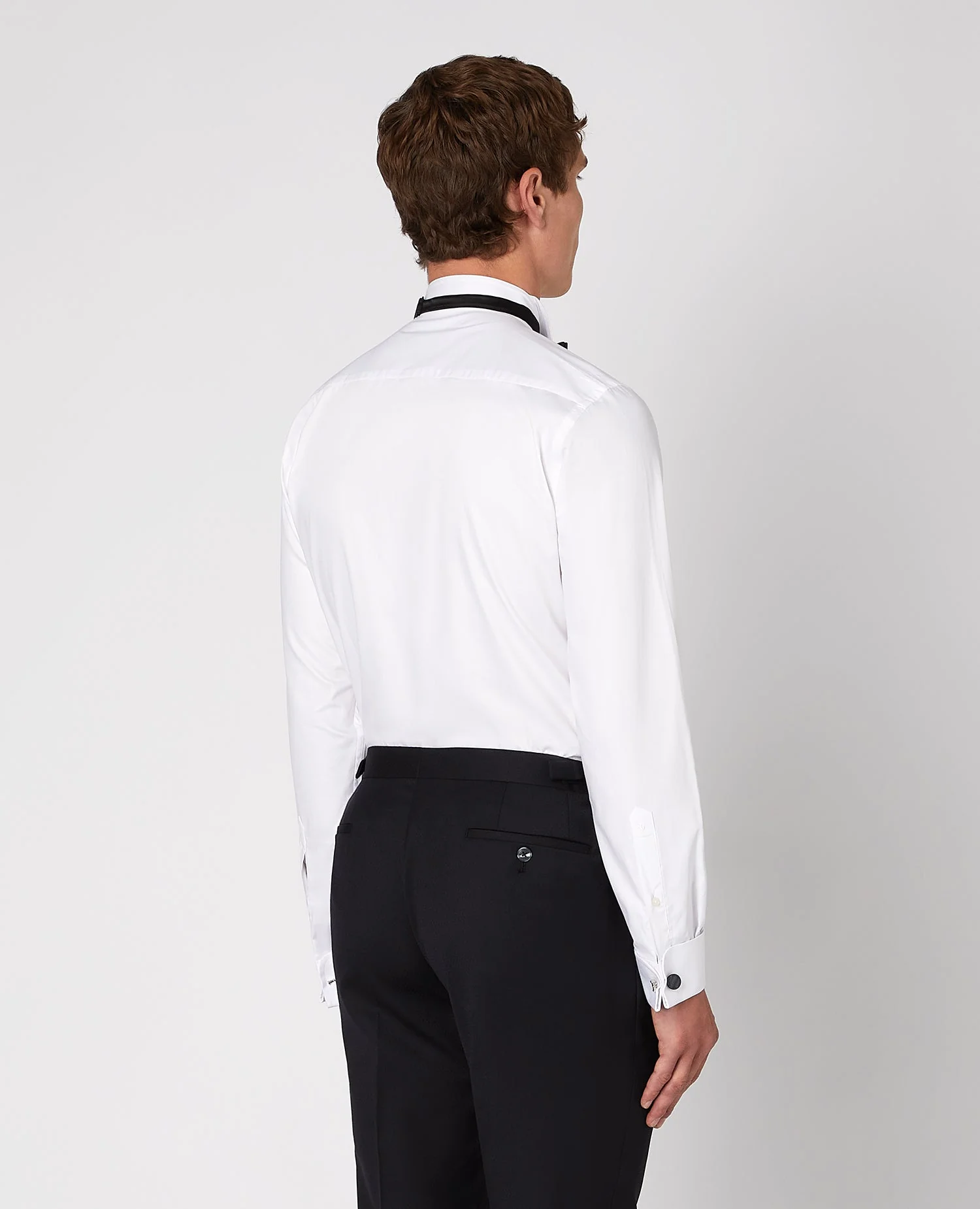 White tapered fit cotton-blend evening shirt with pleated front and wing collar.