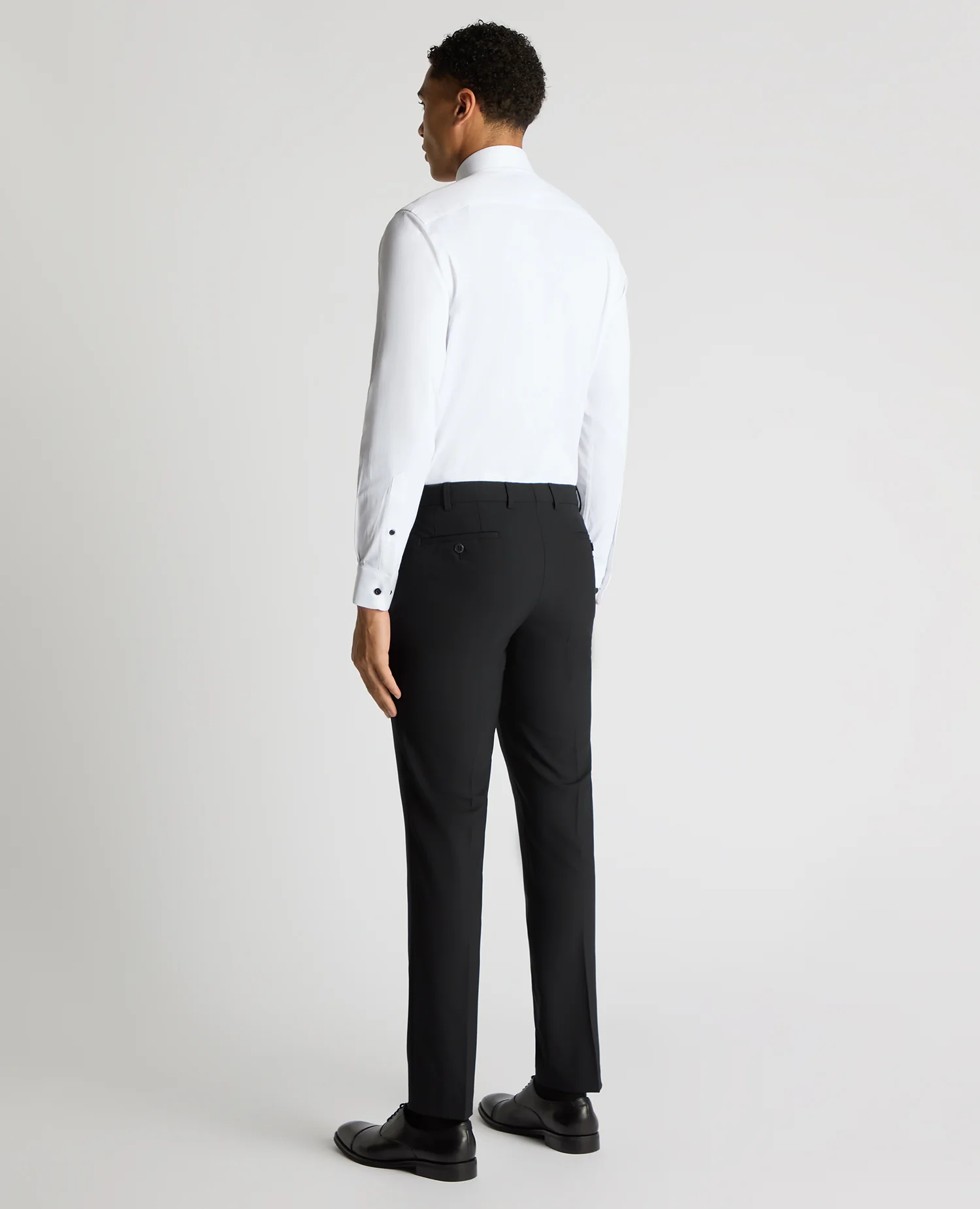 White tapered fit cotton-blend stretch shirt with a cutaway style collar. French front with black buttons, rounded cuffs and a tailed hem.
