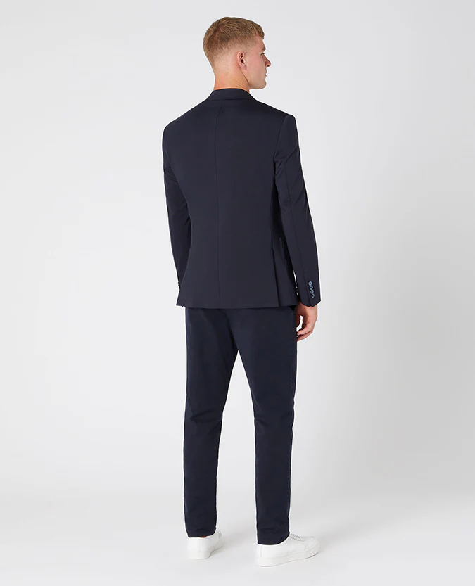 Navy tapered fit cotton-blend stretch jersey jacket with casual soft construction, slim notched lapel with shirt sleeve style shoulder. Single breasted, button two with patch side pockets and side vents.