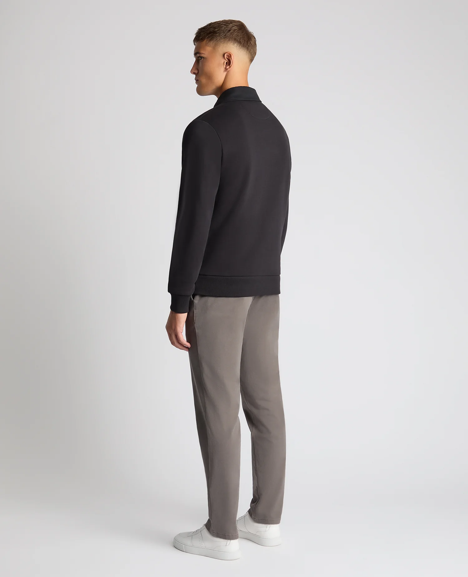 Black regular fit cotton-stretch long sleeve jersey polo shirt with three button closing. This polo is a similar style to our sweatshirts, only with a polo style collar. Organic cotton requires less water to produce, preserves soil for the future, is grown without pesticides, and benefits the ecosystem.