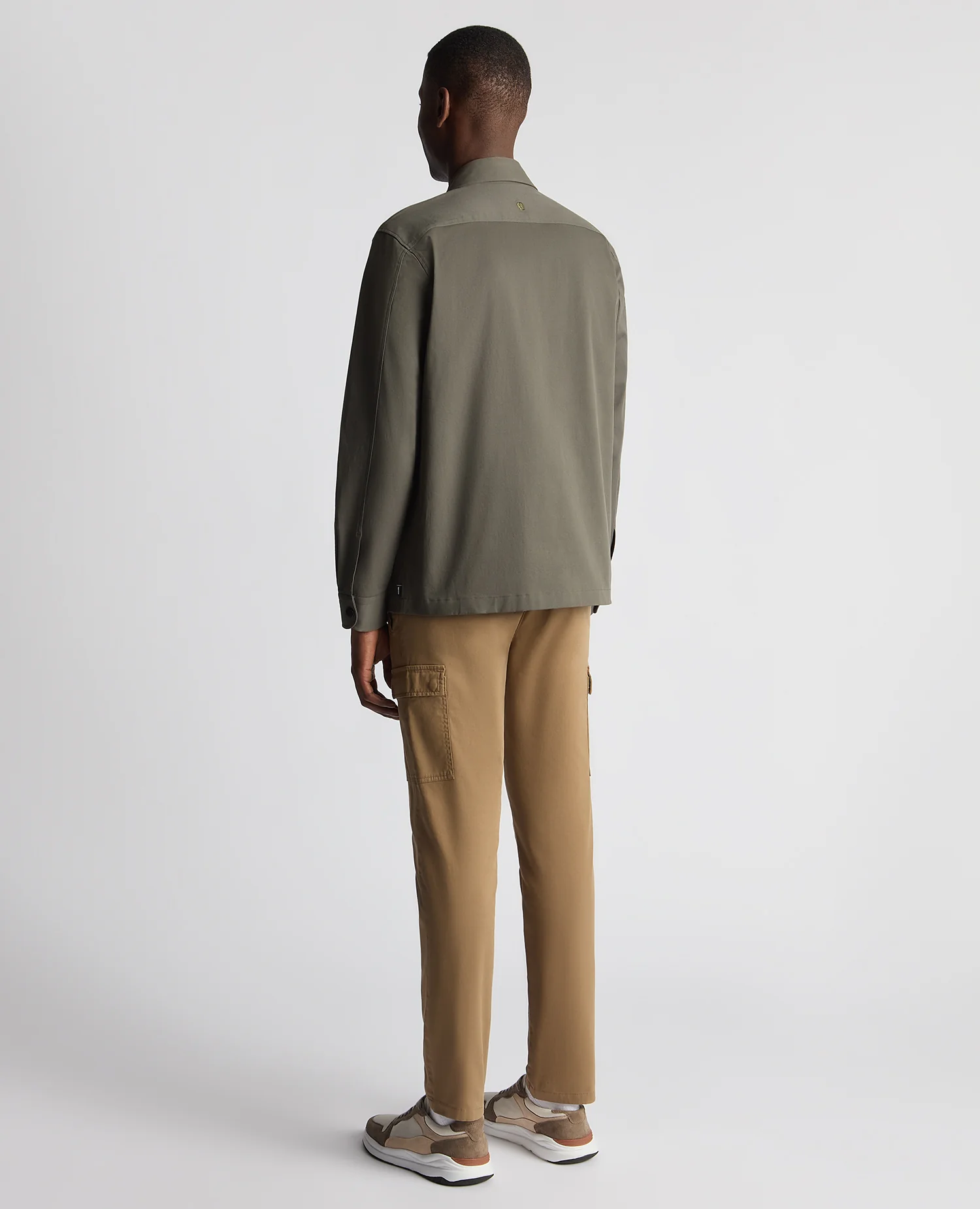 Khaki regular fit cotton stretch overshirt. French front, stud button fastening, double chest pocket with concealed button flaps. Bar tack on chest pockets and sleeve vents, finished with a back yoke loop and flat hem.