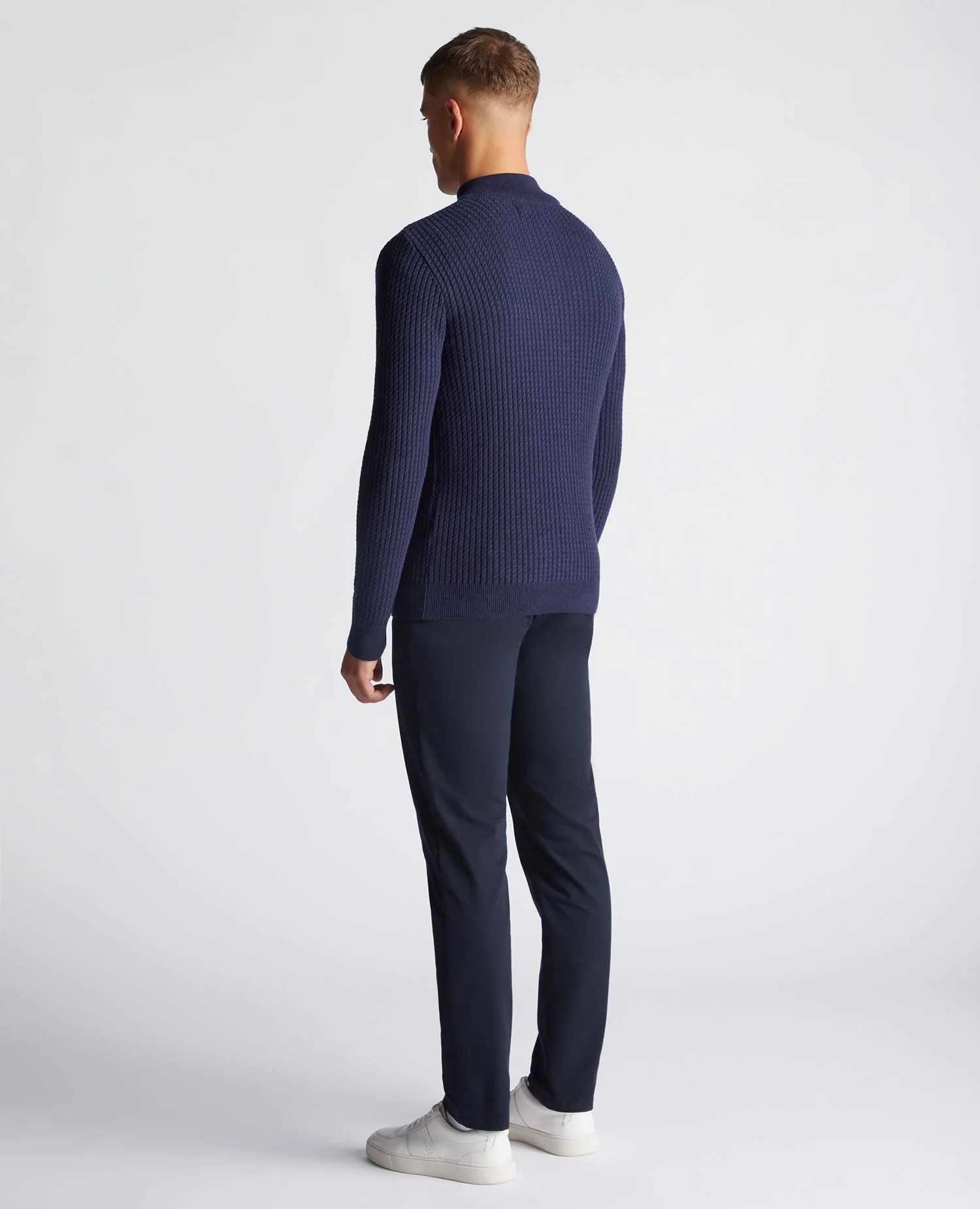 Dark blue tapered fit medium guage pure cotton half zip sweater with all over cable knit structure, ribbed cuff and hem.