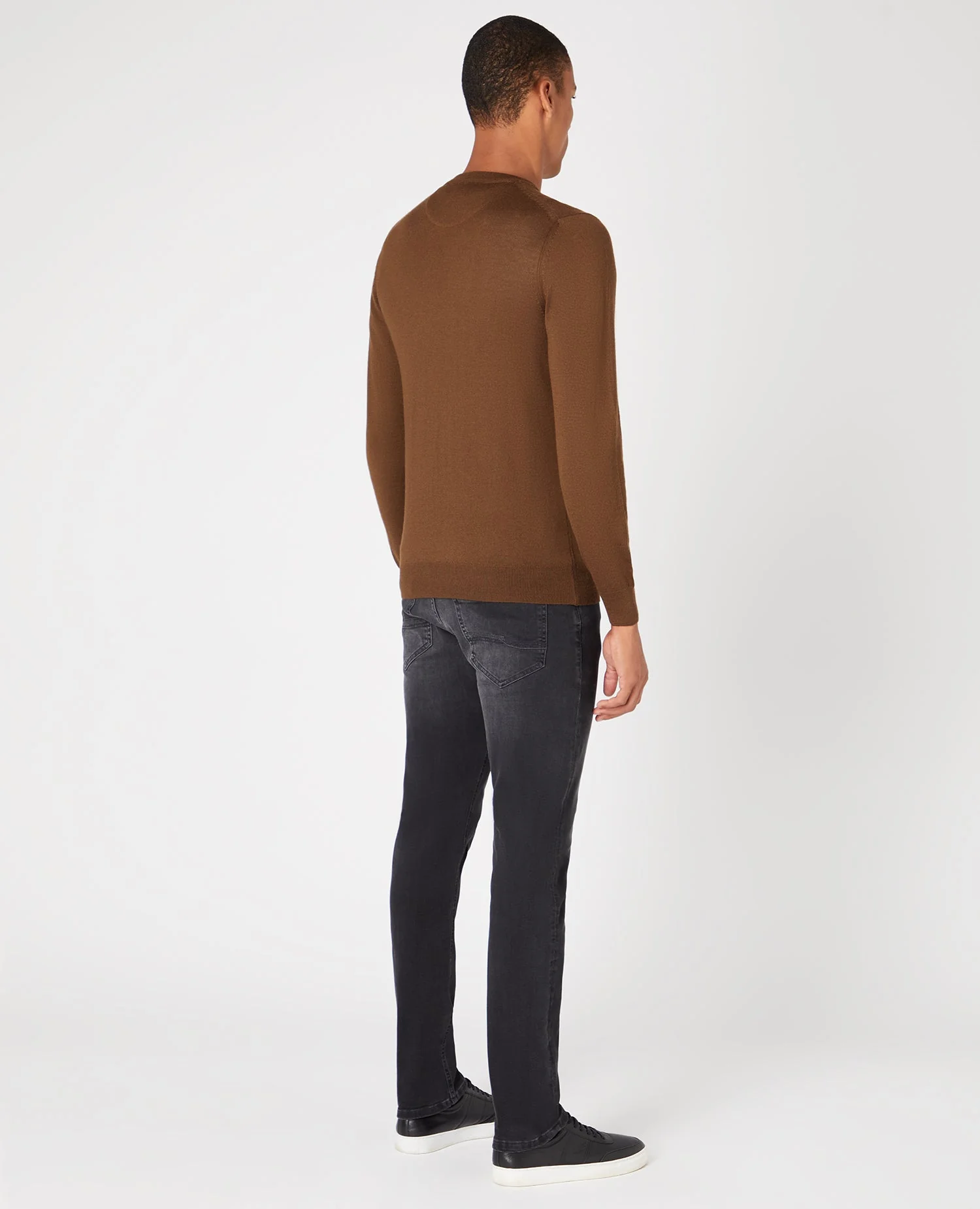 Brown tapered fit fine gauge merino wool-blend crew neck sweater with ribbed cuff and hem.