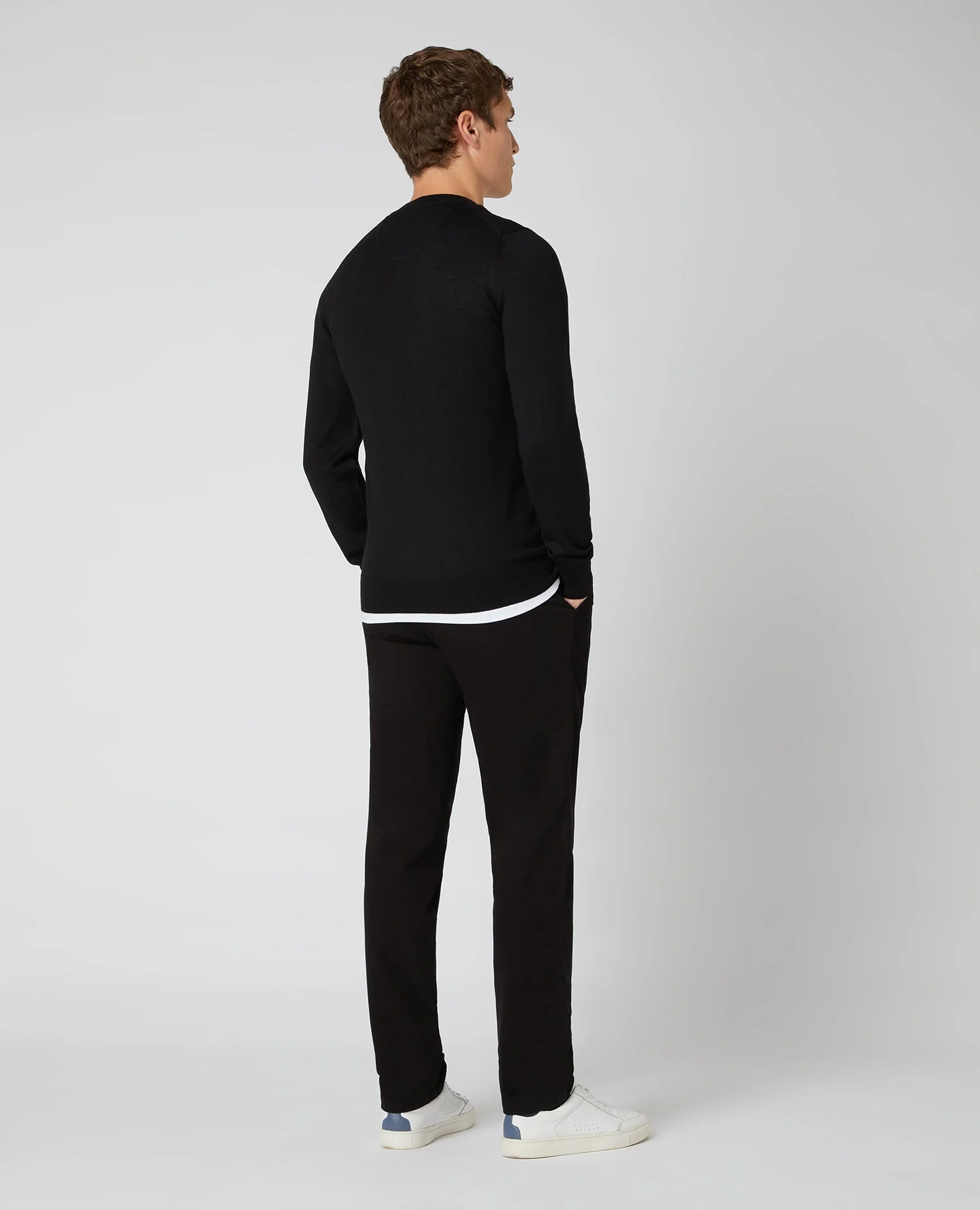 Black tapered fit fine gauge merino wool-blend crew neck sweater with ribbed cuff and hem.