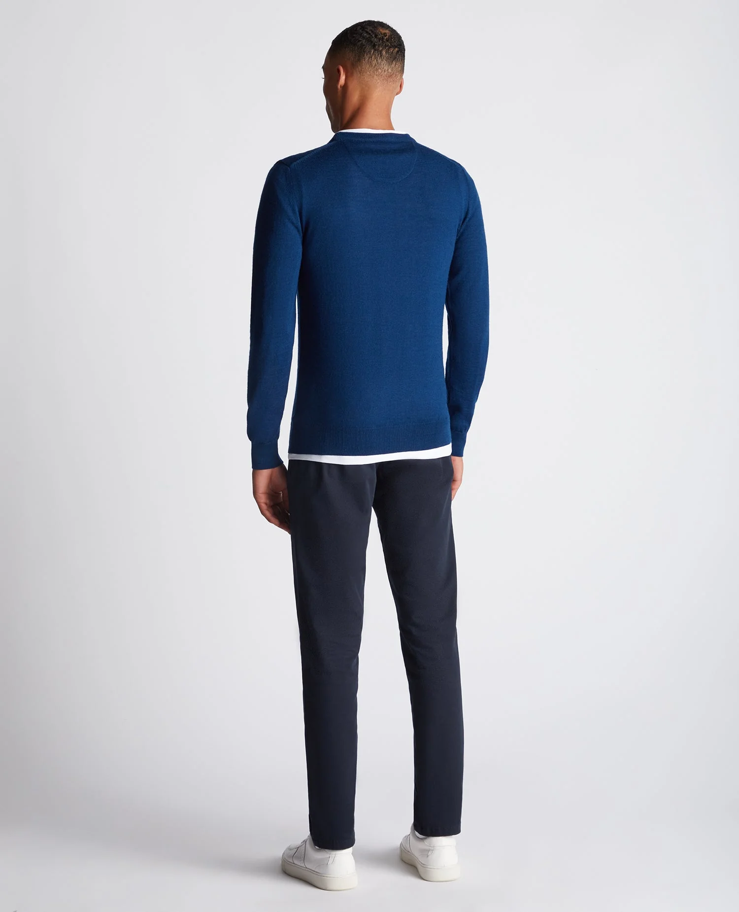 Dark blue tapered fit fine gauge merino wool-blend crew neck sweater with ribbed cuff and hem