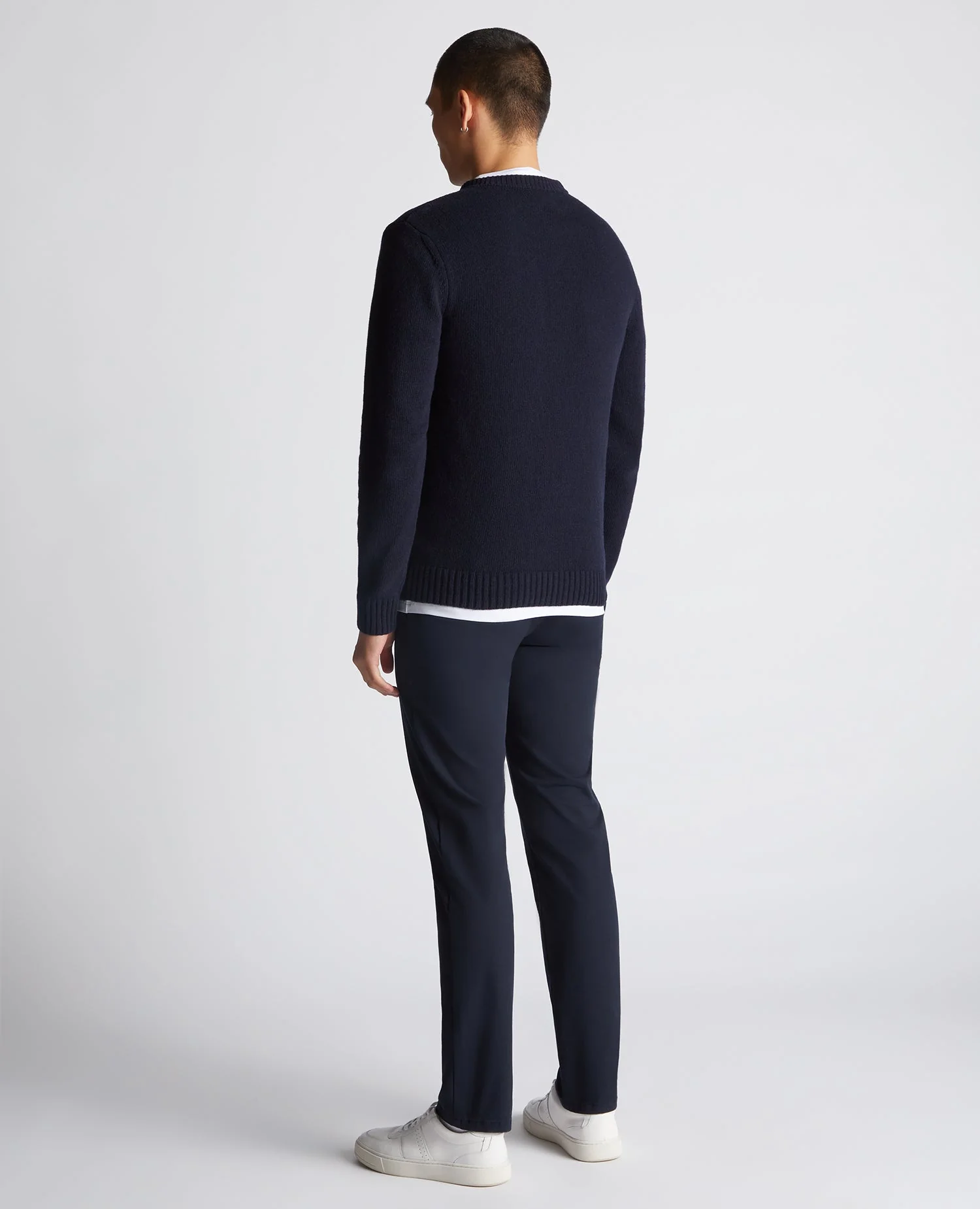 Navy tapered fit medium guage lambs wool-blend crew neck sweater with texture design with ribbed cuff and hem.