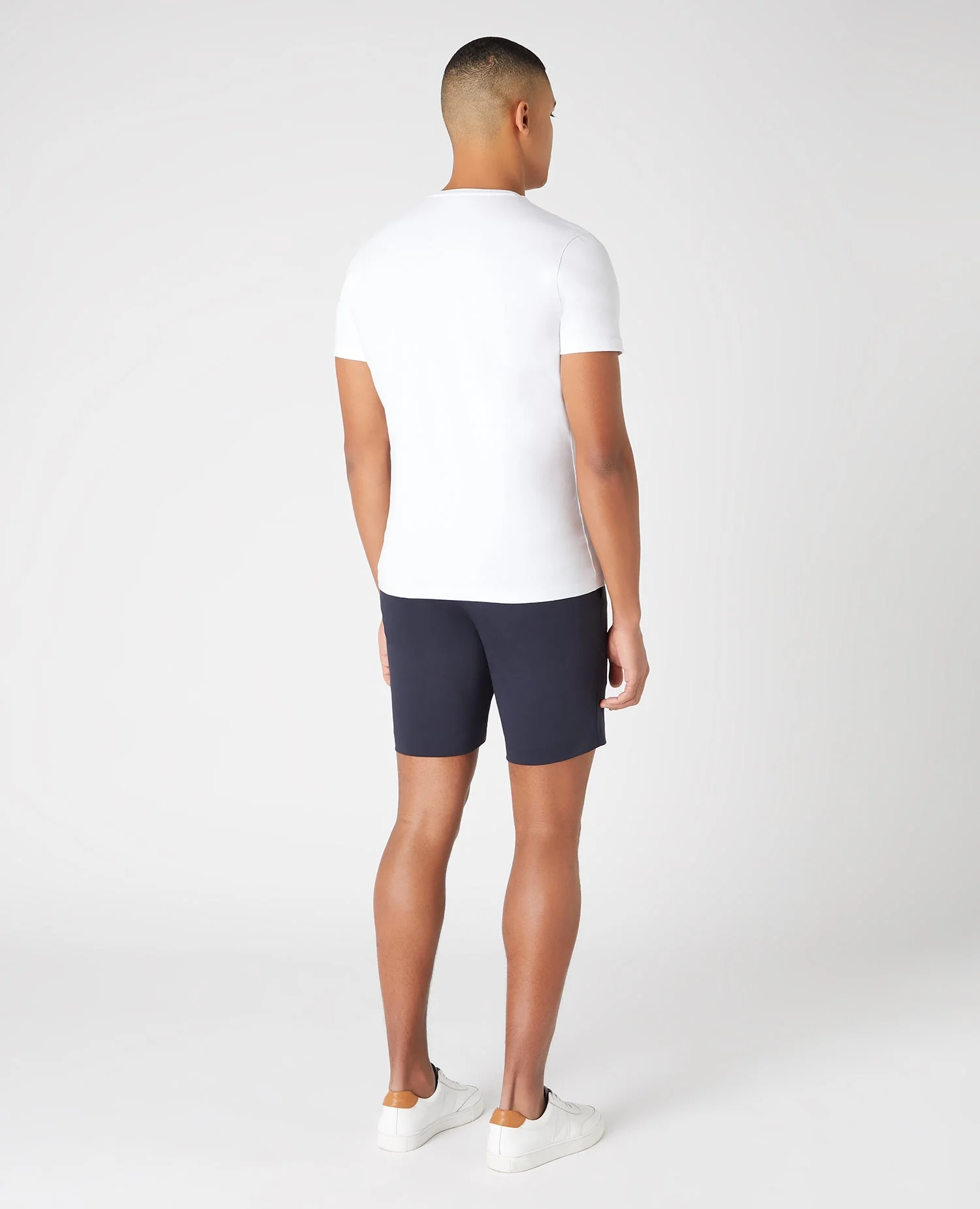 Navy cotton-blend slim fit shorts. With comfortable stretch, concealed front zip, side slip pockets and button pocket on rear.